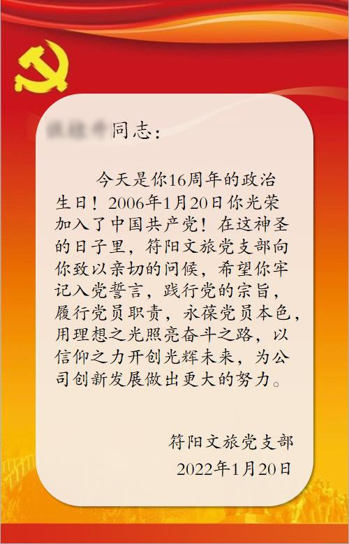 支部在核準每一名黨員入黨時間的基礎(chǔ)上,按照黨員入黨日期建立黨員“政治生日”臺賬,每逢黨員“政治生日”當天,黨支部將在黨員微信群發(fā)一張電子賀卡,讓黨員充分感受到組織的關(guān)懷與溫暖,從而將思想認同轉(zhuǎn)化為牢記初心、堅定信仰的前進動力,努力為公司的創(chuàng)新發(fā)展做出更大貢獻!