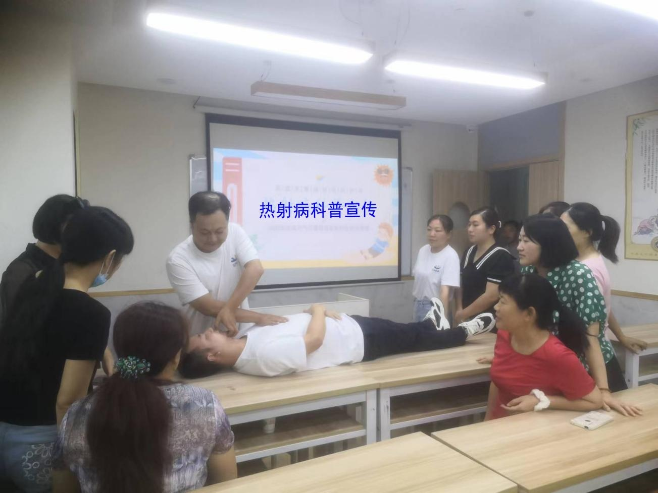 全體員工一起學習熱射病的各種防范措施并進行熱射病的急救演練。 提高大家預防熱射病的意識, 筑牢全校師生的健 康和安全防范屏障,為暑期課程撐起夏日“保護傘”。